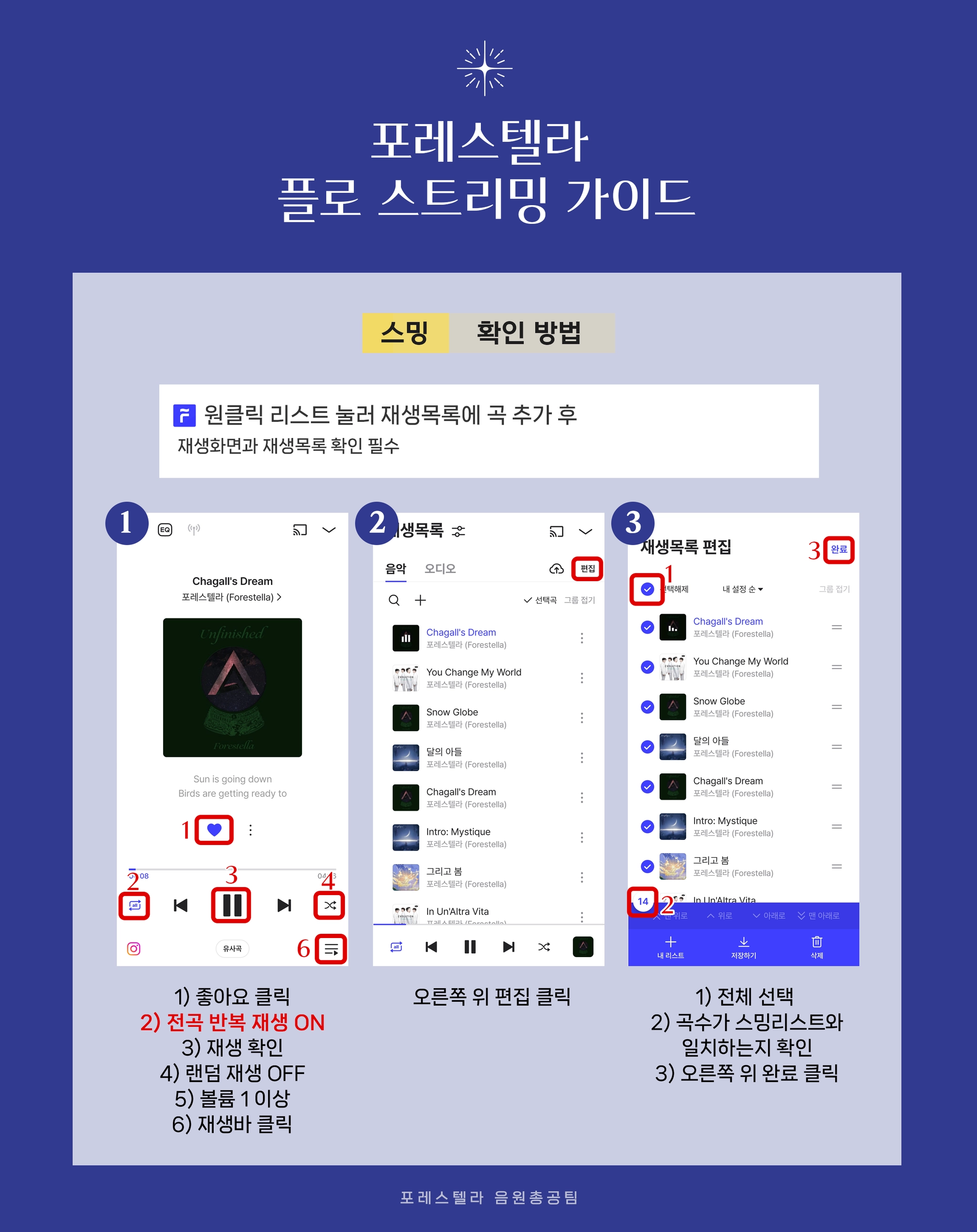 스밍리스트의 곡 순서와 개수가 음원총공팀의 재생목록과 같은지 점검해주세요.