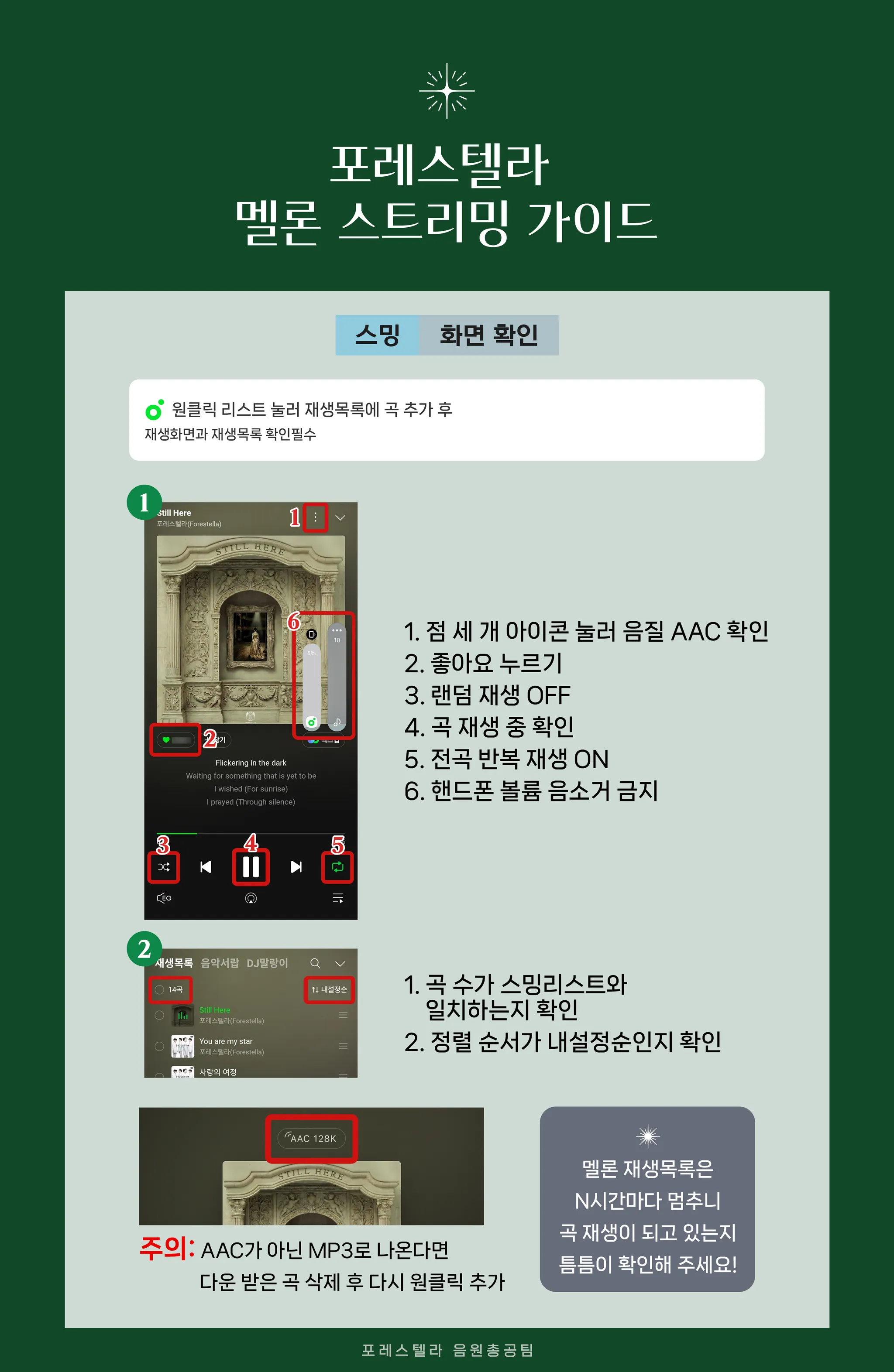 스밍리스트의 곡 순서와 개수가 음원총공팀의 재생목록과 같은지 점검해주세요.