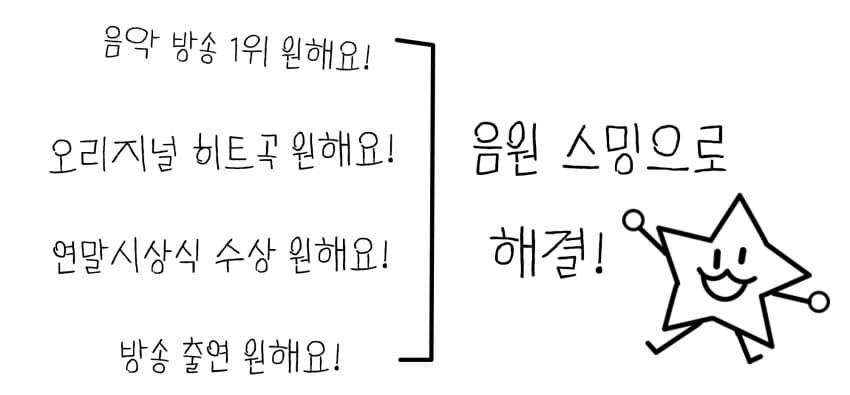 우리는 가수를 지지하는 팬덤입니다. 가수의 음악을 지원하는 스트리밍과 음반 구매는 자연스럽게 이루어져야 하며, 이는 가수의 다음 활동과 직결됩니다.