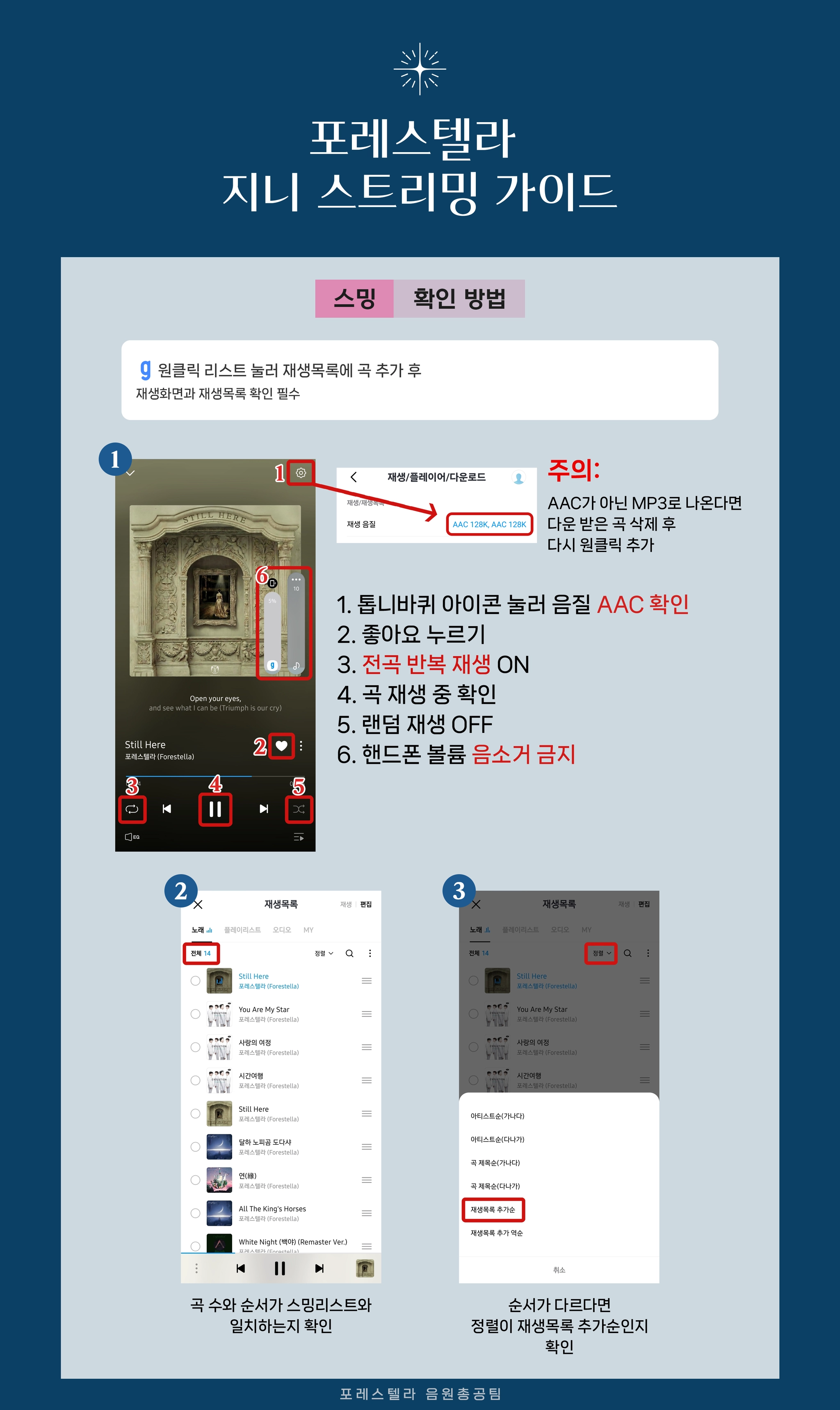 스밍리스트의 곡 순서와 개수가 음원총공팀의 재생목록과 같은지 점검해주세요.